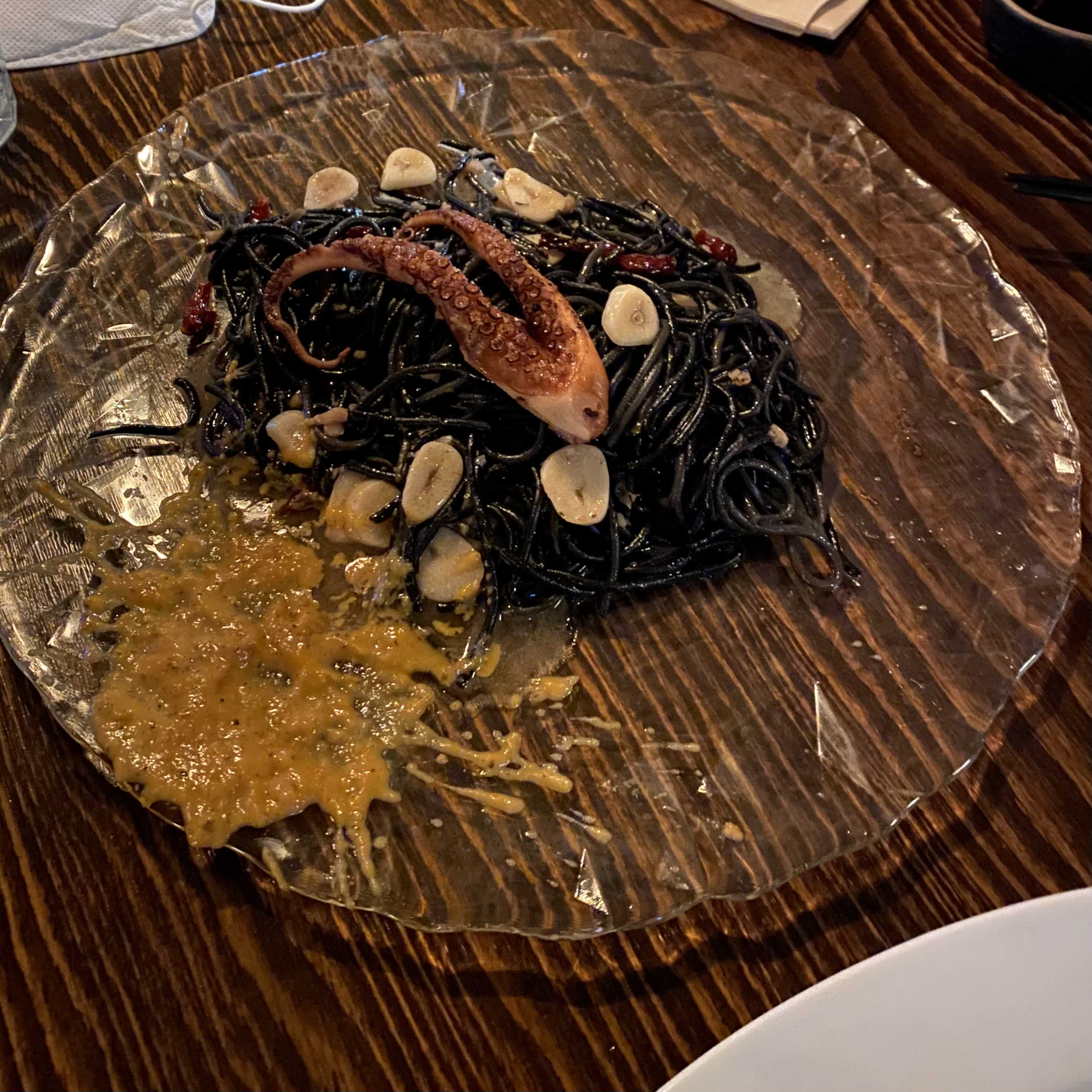 먹물 파스타면이랑 올리브 오일이 잘 어울려서 느끼하지도 않고 맛있었어요.
